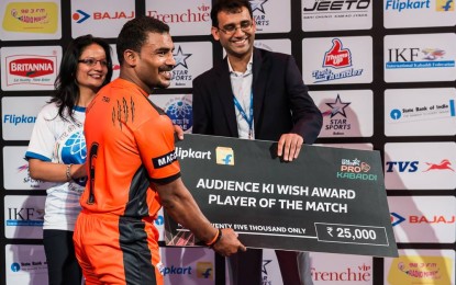 The super defender Jeeva Kumar U Mumba PRO Kabbadi Team has won the title of ‘Nise Gel Most Effective Player’ of the game! during the match with Jaipur Pink Panthers. The U Mumba team won the match by 1 point. It was a nail biting moment at the end.